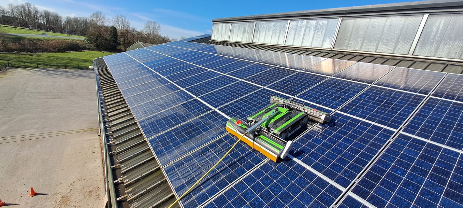 Een perfecte februari dag om te beginnen aan de jaarlijkse reiniging van deze mooie installatie. Twee robots staan al klaar op het dak.